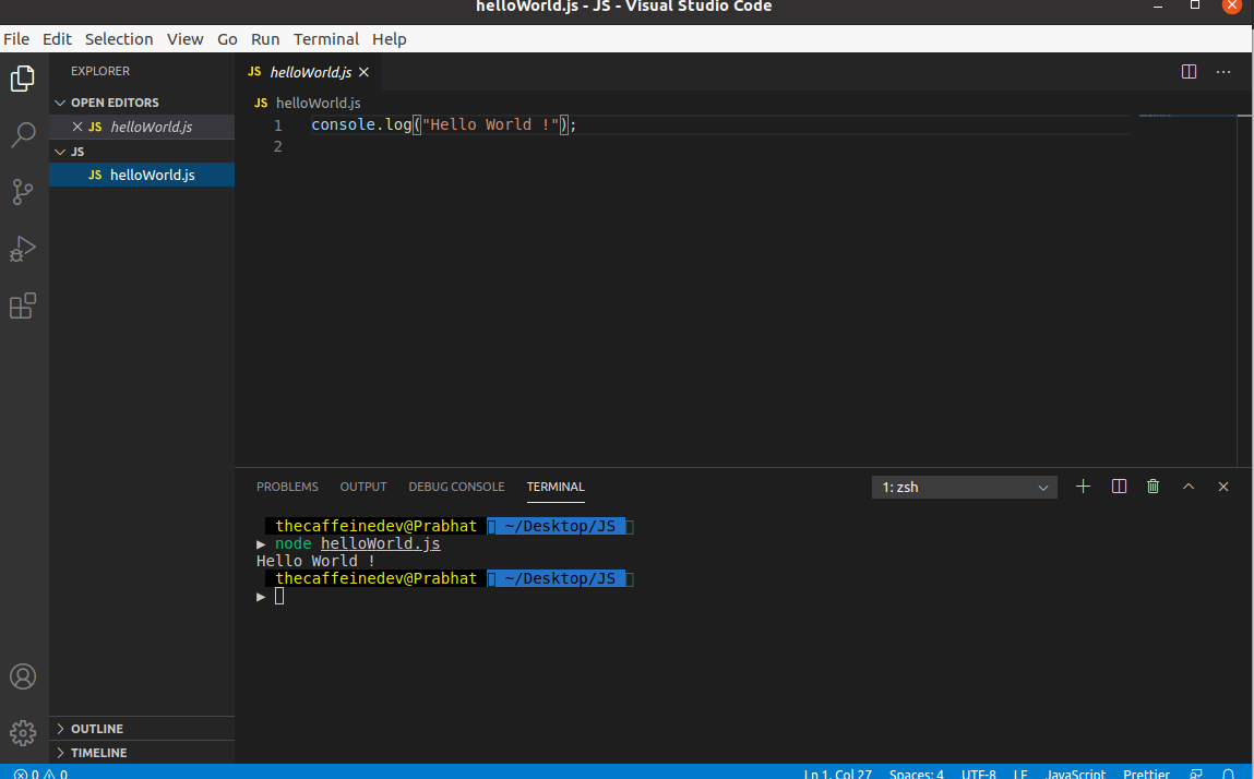 Here you can see I am executing the code like this. I have just console logged Hello World !. It’s like print function in other programming language.