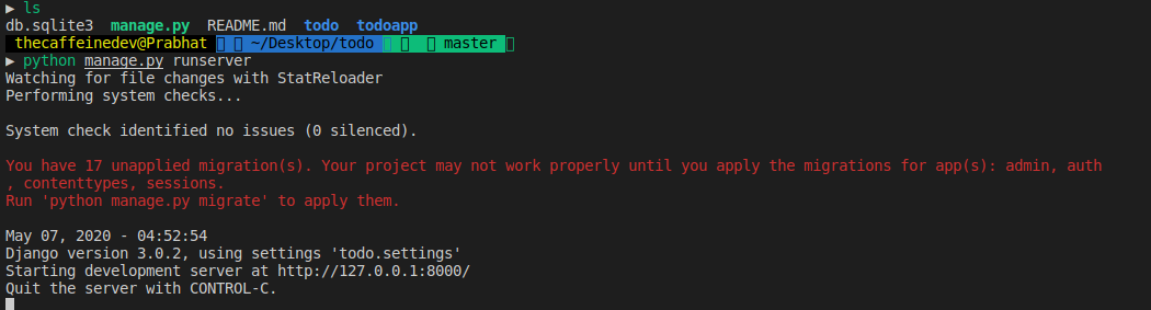 You can see it’s giving us an warning saying “You have 17 unapplied migration(s). ” so let’s do the migrations, to do it run