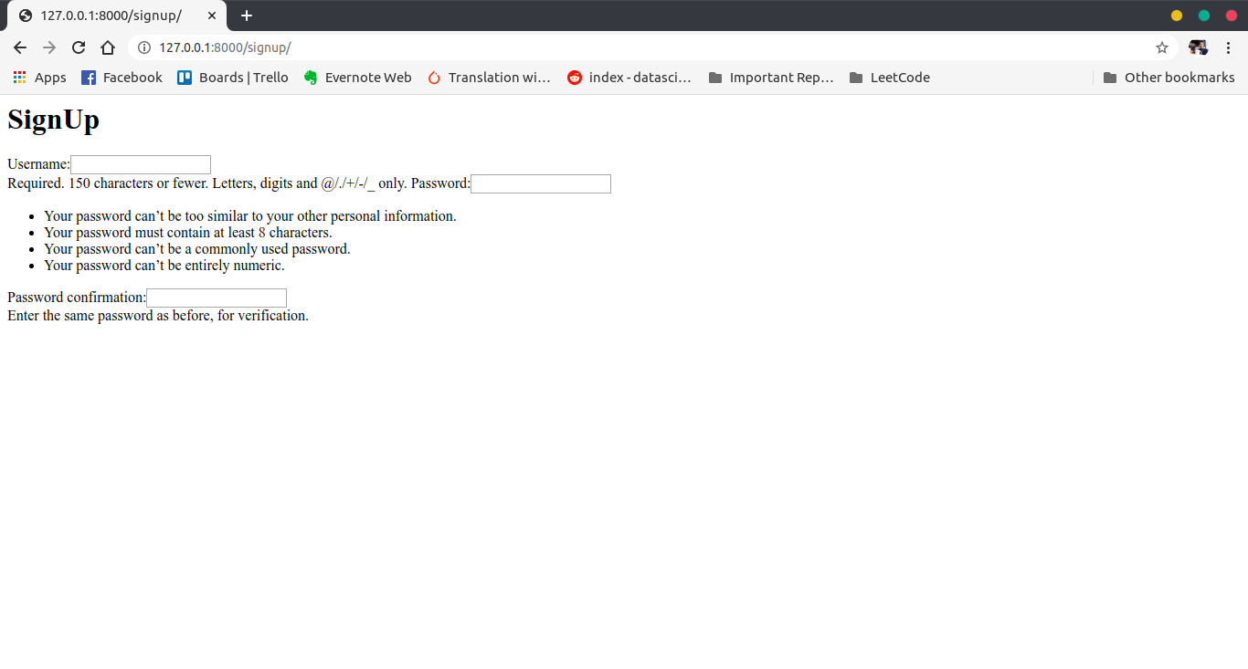 And now if you run the server and go to http://127.0.0.1:8000/signup/ you will be able to see the page below.