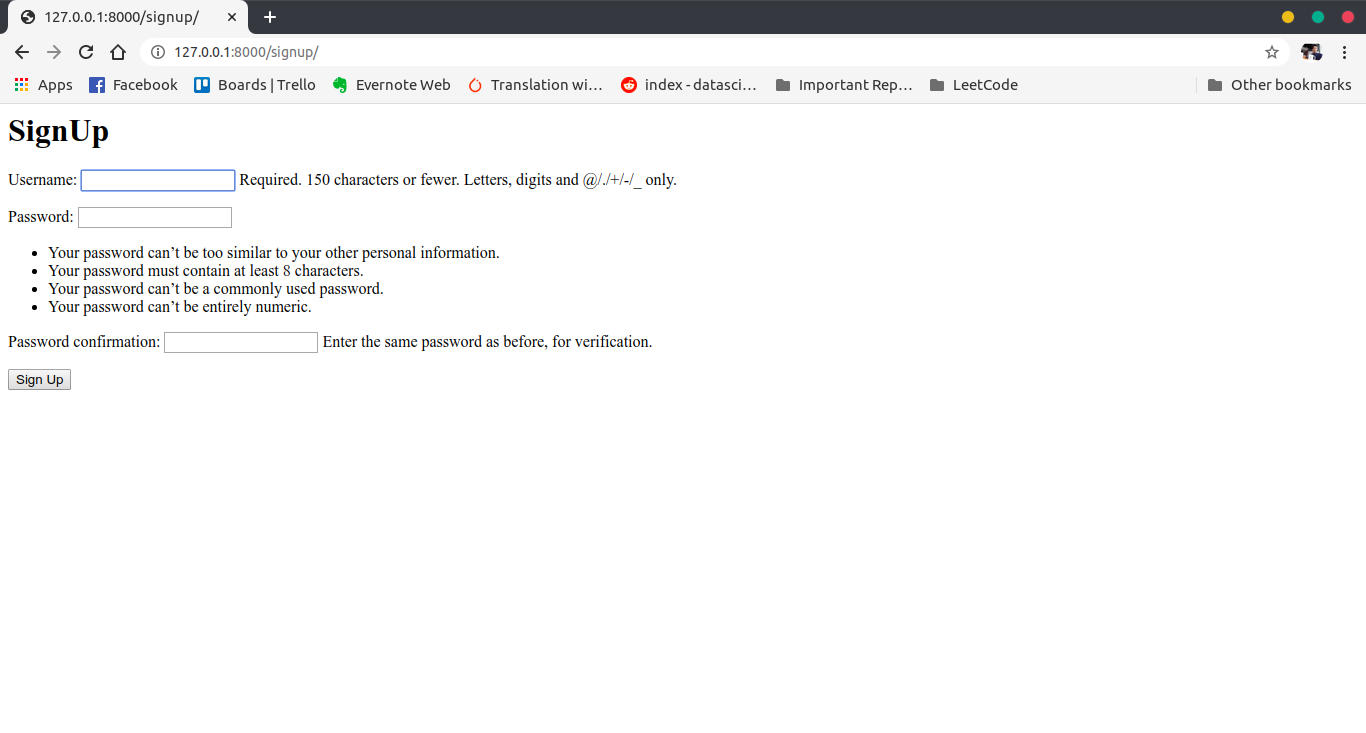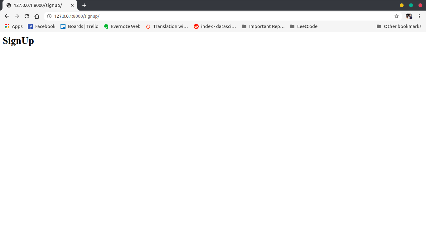 And now if you run the server and go to http://127.0.0.1:8000/signup/ you will be able to see the page below.
