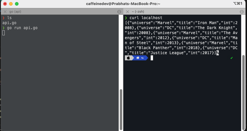 In this file we will define some structures and hardcode some data. TheĀ main function simply listens to the root path on port 80 and returns a JSON response containing all the data in response to all requests.I hardcoded the data in an effort to keep things minimal. By the end of this post you will have the knowledge to enable you to move that data into a real database, also managed by Docker Compose.